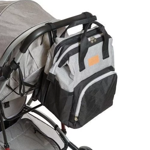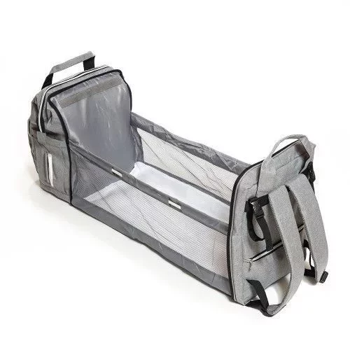 • Mochila maternal convertible en Cuna Portátil. n• Tela acolchonada interna y funciona como Cambiador. n• Con capota desmontable con mosquitero. n• 1 Bolsillo frontal con compartimientos térmicos. n• 2 Bolsillos traseros para celular y antirobo. n• 2 Bolsillos laterales porta mamaderas. n• Ganchos para colgar al manubrio del cochecito.
