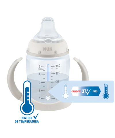 Facilita la transición a beber sin su ayuda, con asas ergonómicas para un agarre seguro El indicador de control de temperatura incorporado cambia de color cuando el contenido está demasiado caliente. El indicador normalmente azul se vuelve blanco Pico antivuelco de silicona suave con zona más suave Recomendado para niños de 6 a 18 meses Capacidad 150ml Se puede combinar con todos los productos NUK First Choice Presentación: Rojo-Gris