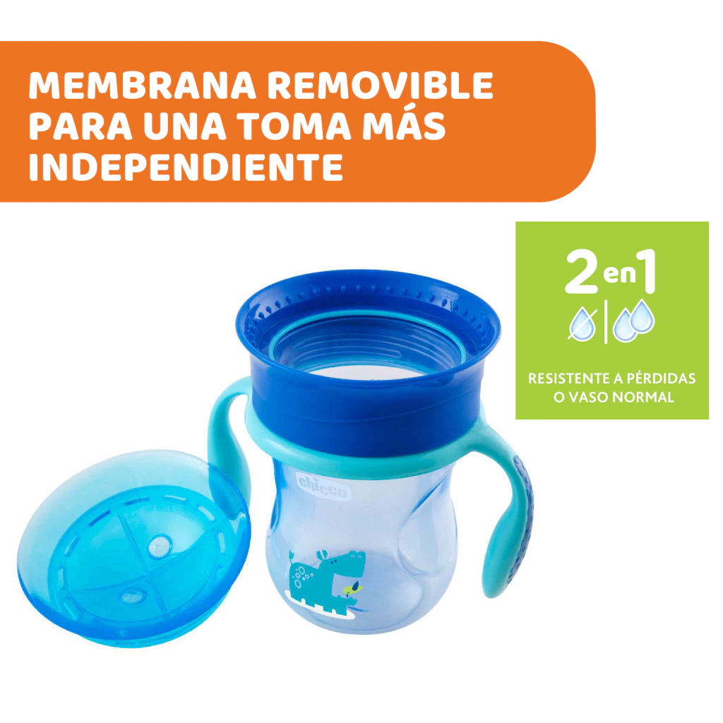 Ideal para aprender a beber de un vaso sin derrames. nLa membrana de silicona 360 se activa con el labio y promueve un consumo independiente, liberando liquidos solo cuando el labio del bebe; se presiona contra el borde, mientras se mantiene resistente a los derrames. nCuenta con una membrana de silicona transparente para que el bebe; pueda ver el liquido que se aproxima y aprenda como decodificar esta entrada. nMembrana removible para aprender a beber con flujo libre, con o sin las asas como un vaso real.