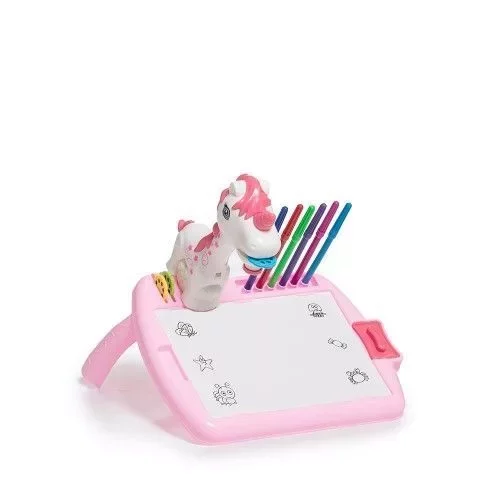 • Pizarra con proyector para calcar, con luz y sonido. n• Incluye 12 marcadores. n• 3 discos con diferentes dibujos (24 dibujos). n• Lleva 3 pilas AAA (no incluidas). n• Medidas: 32 x 23 x 30 cm.