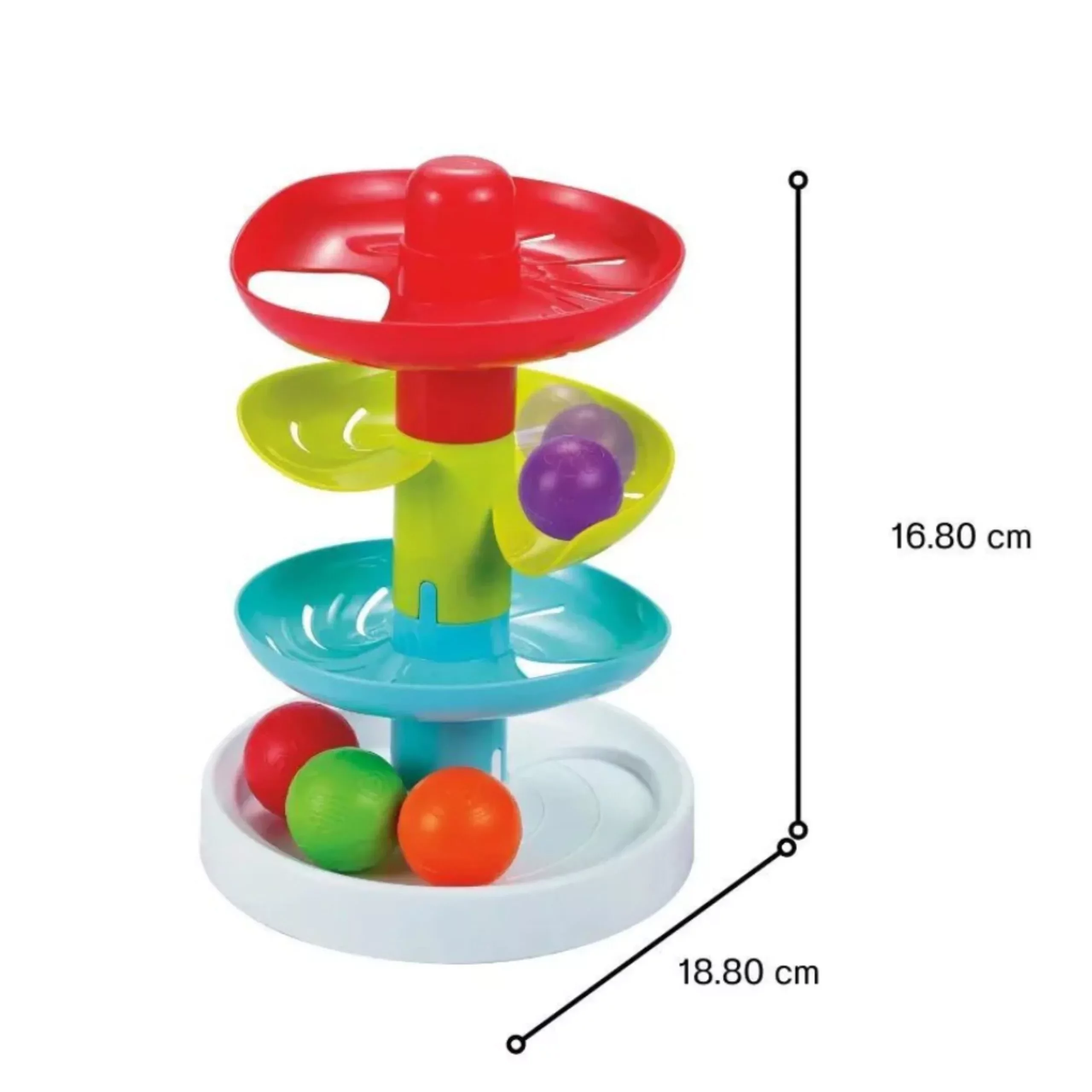 Juguete didáctico diseñado para la primera infancia, ideal para estimular el desarrollo sensorial y la coordinacion ojo-mano. Ayuda también a reconocer los colores. Consiste en una torre con varios niveles por donde las bolas descienden.