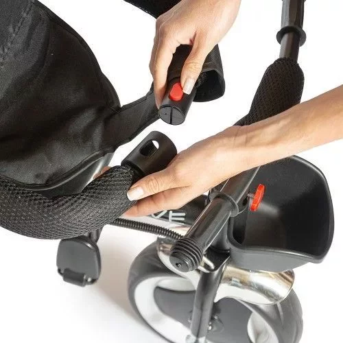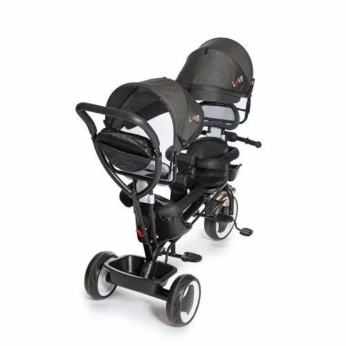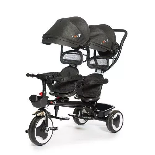 • Triciclo doble direccional con caño reforzado. n• Giratorio 360º ( solo el asiento delantero, el trasero es fijo). n• Rueda delantera 10'' y ruedas traseras 8'' n• Con apoya pies doble plegable y doble barral. n• Guiador con bolsillo porta objetos, doble capota, canasto delantero y trasero.