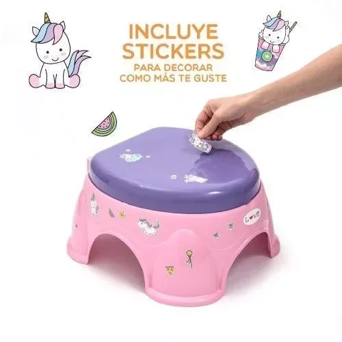 • Pelela 3 en 1: n1) Pelela n2) Adaptador de inodoro con ganchos de fijación. n3) Escalón o banquito. n• Stickers temáticos para decorar y jugar. n• Base antideslizante. n.Colores surtidos. Especificar preferencia de color de la base.