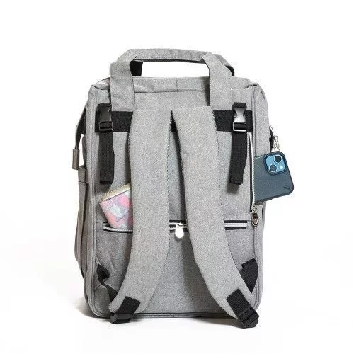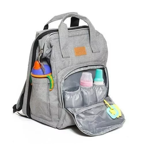 • Mochila maternal convertible en Cuna Portátil. n• Tela acolchonada interna y funciona como Cambiador. n• Con capota desmontable con mosquitero. n• 1 Bolsillo frontal con compartimientos térmicos. n• 2 Bolsillos traseros para celular y antirobo. n• 2 Bolsillos laterales porta mamaderas. n• Ganchos para colgar al manubrio del cochecito.