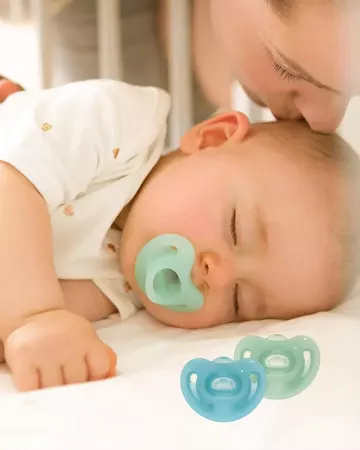 Elaborado 100% de silicona extra suave y flexible. Con escudo ligeramente curvo que envuelve suavemente la cara sin tapar la nariz, ni interferir en la respiración. Forma de la tetina basada en el pezón materno durante el amamantamiento, que se adapta perfectamente a la boca cuando el bebé succiona. Más amable con los dientes gracias a su forma mejorada que reduce la presión en la mandíbula y evita los dientes desalineados. Disponible para 0-6m. Estuche doble apto para transporte y esterilización. Presentación: 2 unidades por estuche.