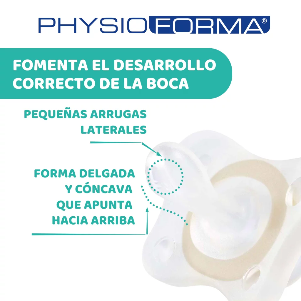 Los chupetes PhysioForma® cuentan con una tetina exclusiva que fomenta el desarrollo correcto y armonioso de la boca y que favorece la respiración fisiológica del bebé, fundamental para el crecimiento. nPhysioForma® MiniSoft son chupetes blandos, pequeños y livianos, son el comienzo perfecto para los recien nacidos. nPresentación: 2 unidades en estuche esterilizador. Colocando los chupetes y agua en el estuche, se pueden esterilizar en el microondas en tan solo 3 minutos.