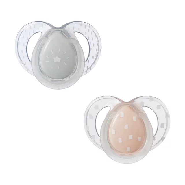 Gama de chupetes aprobados por bebés n¡Brilla en la oscuridad! nLa tetina ortodóntica simétrica ha sido diseñada especialmente para ayudar a optimizar la aceptación del bebé y, en pruebas independientes, la mayoría de los bebés los aceptaron desde el primer uso. nLa tetina en forma de ortodoncia simétrica ha sido diseñada para mejorar el equilibrio, lo que facilita que los bebés sostengan el chupete en la boca y apoyan el desarrollo oral natural. nLa forma de la tetina en el chupete es más como una tetina para una sensación más familiar para un bebé.