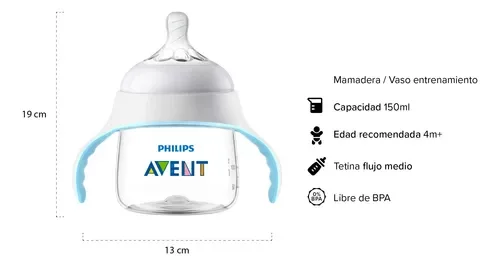 La mamadera Avent Natural de 150 ml está diseñada para facilitar la transición entre lactancia materna y alimentación con mamadera. Sus asas suaves al tacto permiten que el bebé la sujete cómodamente, mientras que la tetina Natural de flujo medio, recomendada a partir de los 4 meses, imita la forma del pecho materno para un agarre seguro y natural. Fabricada con materiales libres de BPA*, ofrece una experiencia de alimentación práctica, segura y confortable.