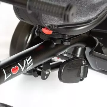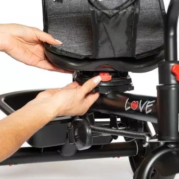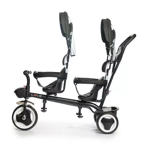 • Triciclo doble direccional con caño reforzado. n• Giratorio 360º ( solo el asiento delantero, el trasero es fijo). n• Rueda delantera 10'' y ruedas traseras 8'' n• Con apoya pies doble plegable y doble barral. n• Guiador con bolsillo porta objetos, doble capota, canasto delantero y trasero.